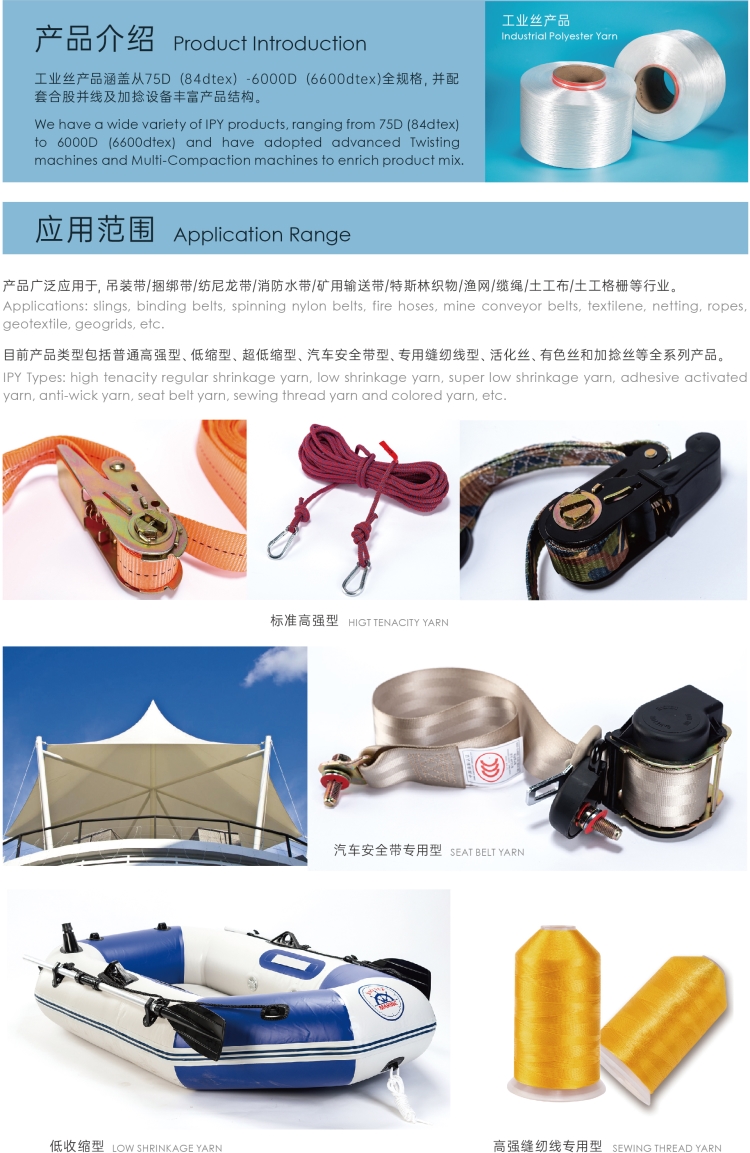 Product application:Applications: slings, binding belts, spinning nylon belts, fire hoses, mine conveyor belts, textilene, netting, ropes, geotextile, geogrids, etc.IPY Types: high tenacity regular shrinkage yarn, low shrinkage yarn, super low shrinkage yarn, adhesive activated yarn, anti-wick yarn, seat belt yarn, sewing thread yarn and colored yarn, etc.