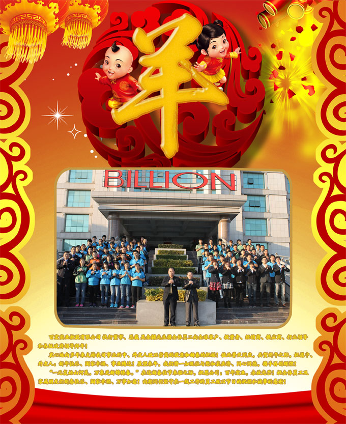 衷心地向多年来支持我司事业的中、外友人致以崇高的敬意和新春的祝福!值此普天同庆,共贺新年之际,祝愿中、外友人:新年快乐、阖家幸福、事业腾达!展望来年,我们将一如既往与您和衷共济、同心同德,携手再创辉煌!