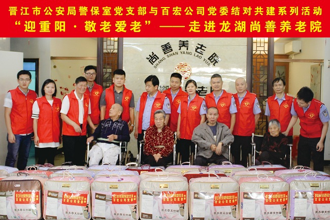 签约仪式结束后,在乐鱼(中国)叶敬平书记的带领下,晋江市公安局领导及警保室党支部代表参观了乐鱼(中国)CD区生产车间,党建展馆、员工活动中心,深入现场了解乐鱼(中国)、认识乐鱼(中国)。随后,一行人走进龙湖镇尚善养老院,开展“迎重阳·敬老爱老”活动,为养老院的长辈们送去一批过冬所需的棉被。