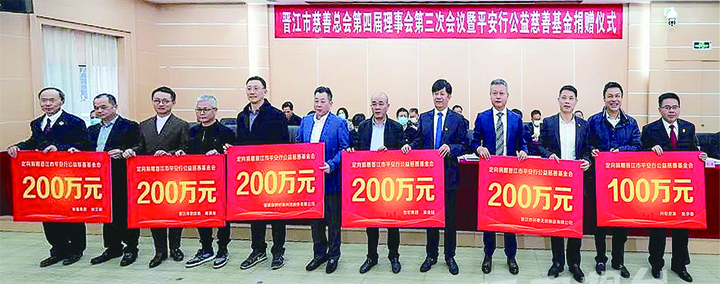 今年,晋江设立“平安行公益慈善基金”,创新推进平安晋江建设,各界乡贤积极响应参与,分别捐赠50万--500万元善款,总金额超亿元。会议还推选市慈善总会理监事会新成员,向元旦春节困难对象代表颁发慰问金。