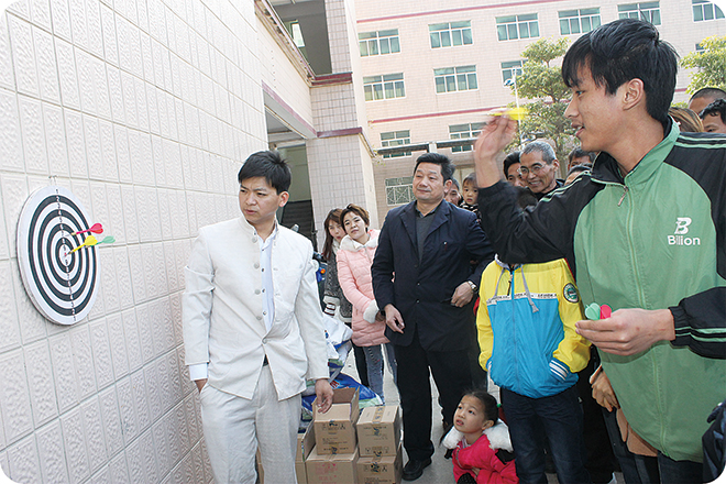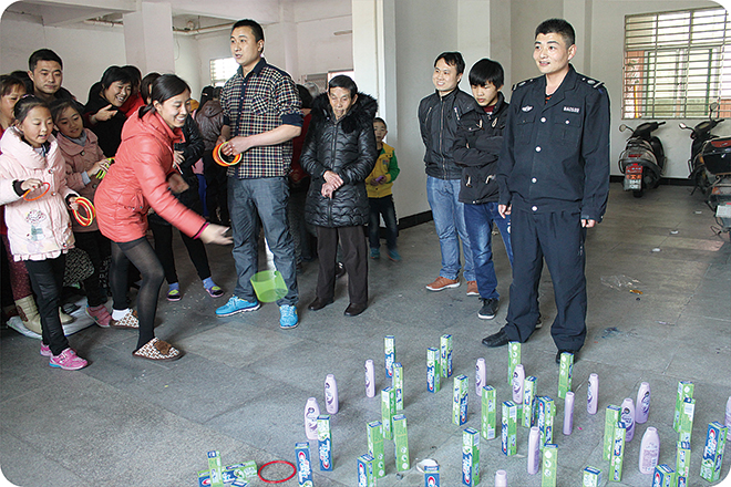 2月19號(正月初壹)下午2點半,留廠員工陸陸續續來到籃球場,排隊等待 “套圈圈”。在6米×2米的長方形場地內,從起套線約2米處依次序放置了洗發水、牙膏等小獎品,參與者每人領取5個圈,套5次,依得分成績領取獎品。