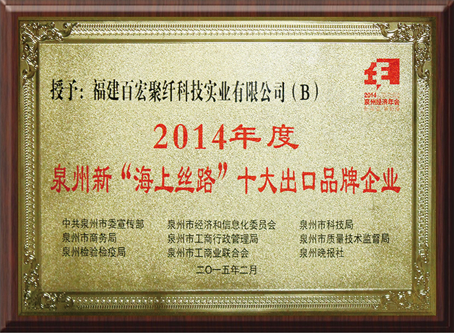 2015年3月4日下午,由泉州市委宣傳部、市經信局、市科技局等聯合主辦,以“新常態·新跨越”為主題的2014泉州經濟年會年度峰會在泉州悅華酒店舉行,峰會現場公布了各行業、各領域優秀企業的獲獎榜單,福建乐鱼(中国)聚纖科技實業有限公司榮獲2014年度泉州新“海上絲路”十大出口品牌企業。
