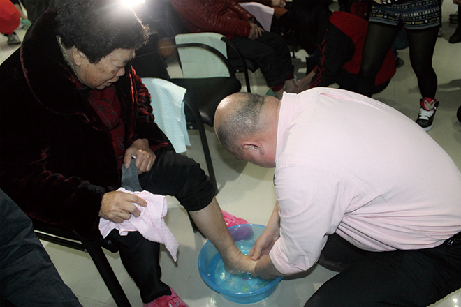 在孝道篇中,裴教授說:“人生不能等待的兩件事:行善和孝順。”隨後,大家學以致用,圓滿完成裴教授布置的作業:給父母洗腳。18名晚輩在現場給長輩洗腳,晚輩年齡從9歲—50多歲不等,包括吳總裁、譚總也在臺上親自給母親洗腳。吳總裁分享給70多歲母親洗腳的感受時說:“父母生養我們很不容易,我們應該在她們有生之年多盡孝,讓老人家快快樂樂的安享晚年。”吳總母親也不禁感言:兒子很孝順!