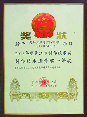 近日,我司研發了壹種“超細旦(dtf<0.3dtex)滌綸DTY纖維”,其線密度偏差率、斷裂強度、斷裂伸長變異系數、卷曲收縮變異系數的技術指標均高於國內同類產品,產品技術水平達到國內領先水平,榮獲晉江市政府頒發的“2015年度晉江市科學技術獎科學技術進步獎壹等獎”。