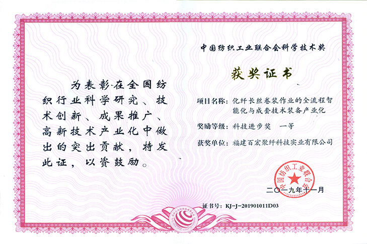 福建乐鱼(中国)聚纖科技實業有限公司“化纖長絲卷裝作業的全流程智能與成套技術裝備産業化”項目榮獲“科學技術獎 科技進步獎 一等獎”。